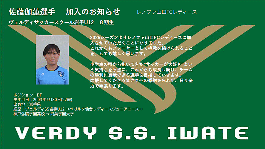 ヴェルディサッカースクール岩手U12を卒団した 佐藤伽蓮選手 が「レノファ山口FCレディース」へ入団が内定しました。